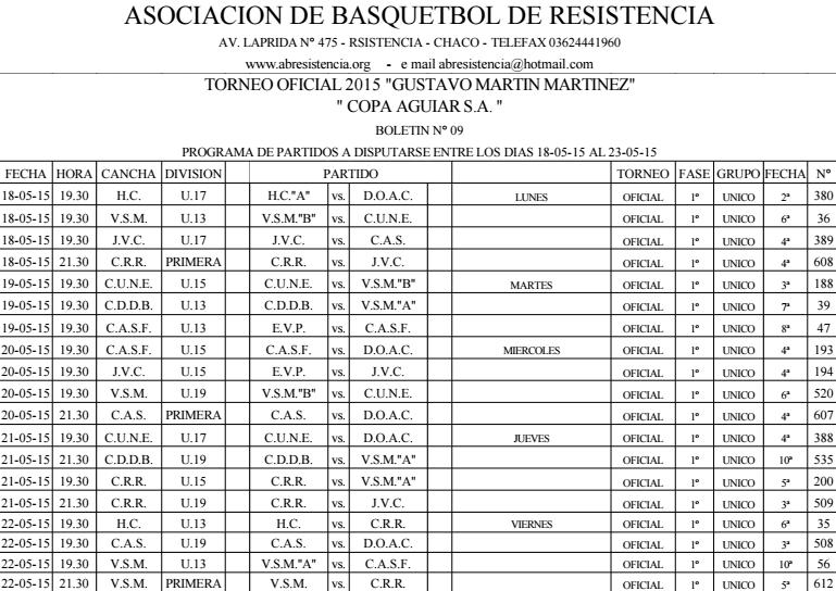 ASOCIACION DE BASQUETBOL DE RESISTENCIA. Programación de la ABR entre el 18 y el 23 de mayo de 2015.