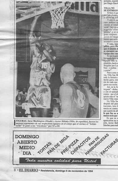 HISTORIA. Noviembre de 1994. Super Basquet como suplemento de EL DIARIO DE LA REGION. Y el clásico entre Hindú y Villa San Martín que pone frente a frente a dos de las figuras de entonces. Por el lado del bólido verde, Steven Washington y por el de los tricolores, Javier Skibsky. El triunfo ésa vez – reflejado a página completa- fue para Hindu, por 91-80 con Steve como goleador, con 25 mientras que en Villa, El Demonio Diego Sánchez sumaba 20 viniendo desde el banco.