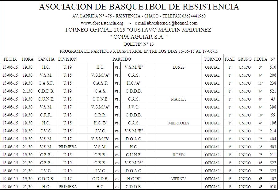 ASOCIACION DE BASQUETBOL DE RESISTENCIA. Programación de la ABR entre el 15 y el 19 de junio de 2015.