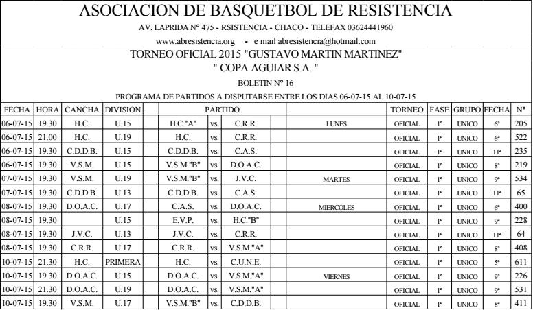 ASOCIACION DE BASQUETBOL DE RESISTENCIA. Programación de la ABR entre el 6 y el 10 de Julio de 2015.