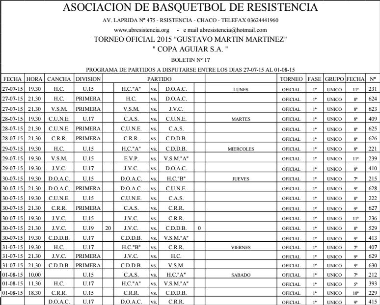 ASOCIACION DE BASQUETBOL DE RESISTENCIA. Programación de la ABR entre el 27 de Julio y el 1 de Agosto de 2015.