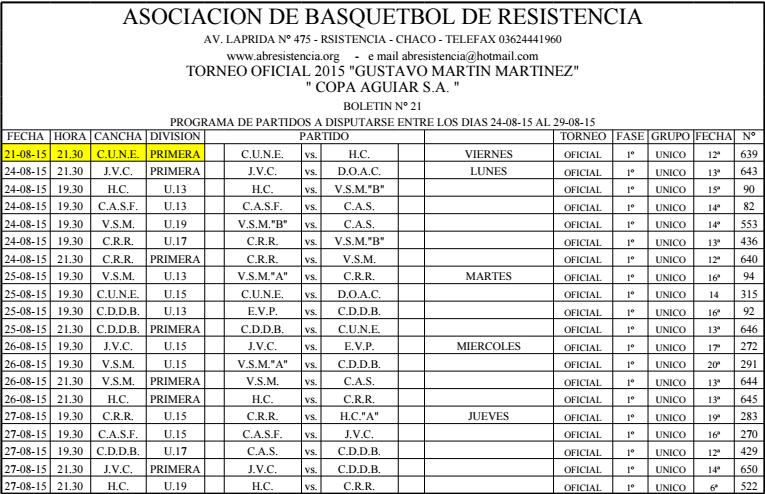 ASOCIACION DE BASQUETBOL DE RESISTENCIA. Programación de la ABR entre el 24 y el 29 de Agosto de 2015.