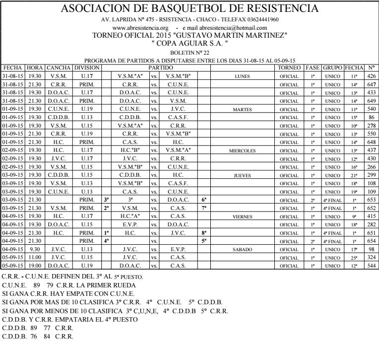 ASOCIACION DE BASQUETBOL DE RESISTENCIA. Programación de la ABR entre el 31 de Agosto y el 5 de Septiembre.