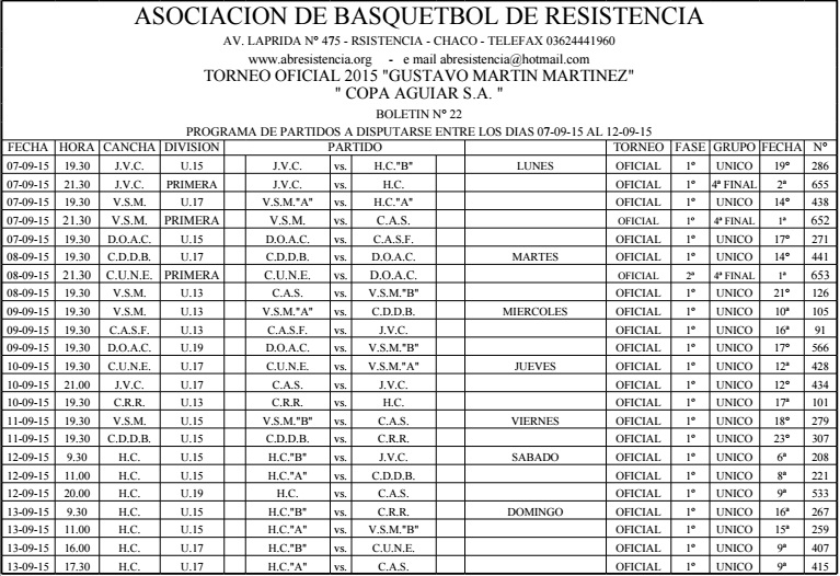 ASOCIACION DE BASQUETBOL DE RESISTENCIA. Programación de la ABR entre el 7 y el 12 de Septiembre.