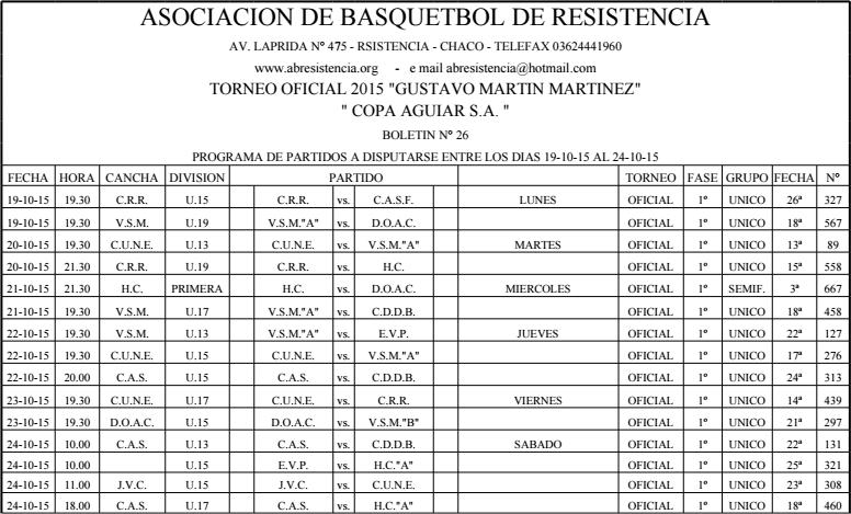 ASOCIACION DE BASQUETBOL DE RESISTENCIA. Programación de la ABR entre el 19 y el 24 de Octubre.