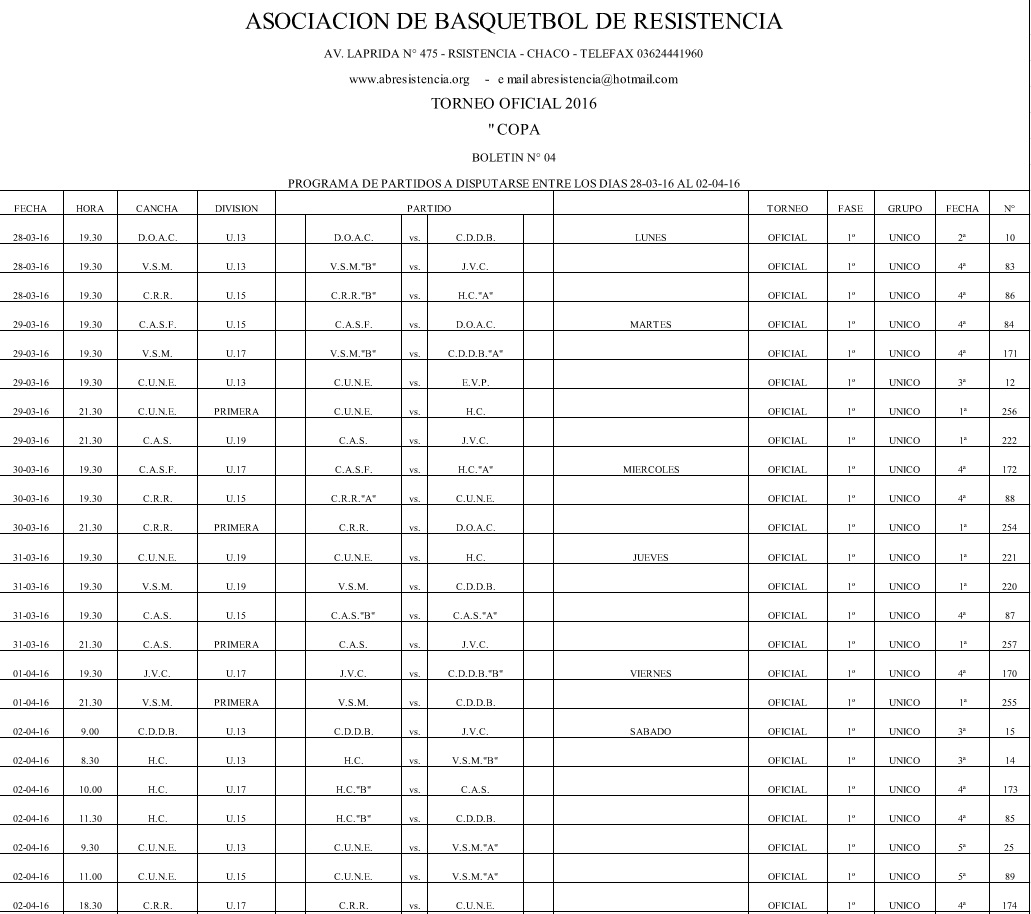 ASOCIACION DE BASQUETBOL DE RESISTENCIA. Programación de la ABR entre el el 28 de Marzo y el 2 de Abril.