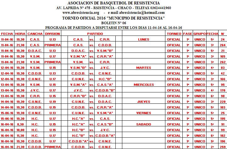 ASOCIACION DE BASQUETBOL DE RESISTENCIA. Programación de la ABR entre el 11 y el 16 de Abril.