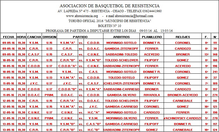 ASOCIACION DE BASQUETBOL DE RESISTENCIA. Programación de la ABR entre el 9 y el 13 de Mayo.