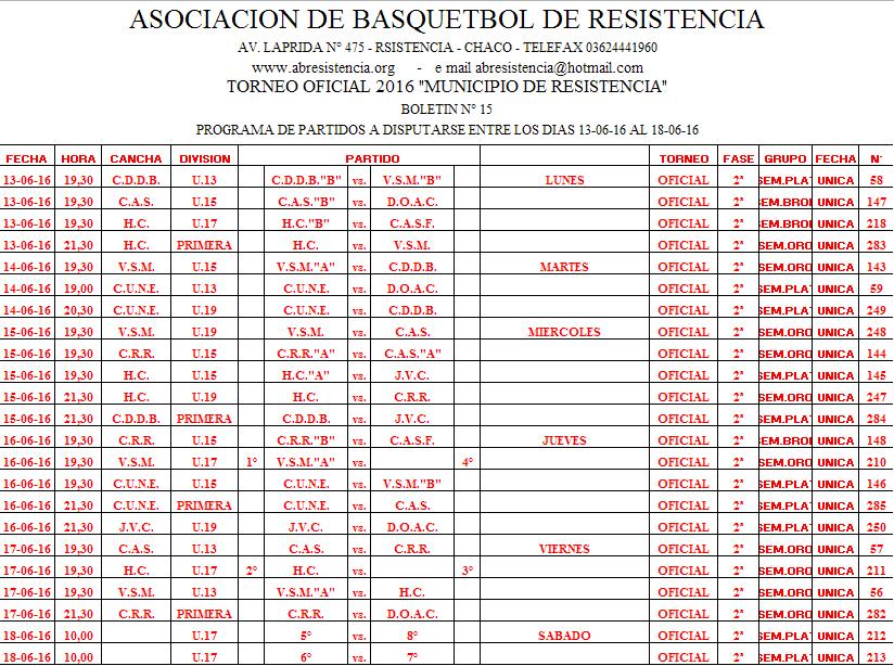 ASOCIACION DE BASQUETBOL DE RESISTENCIA. Programación de la ABR entre el 13 y el 18 de Junio de 2016.