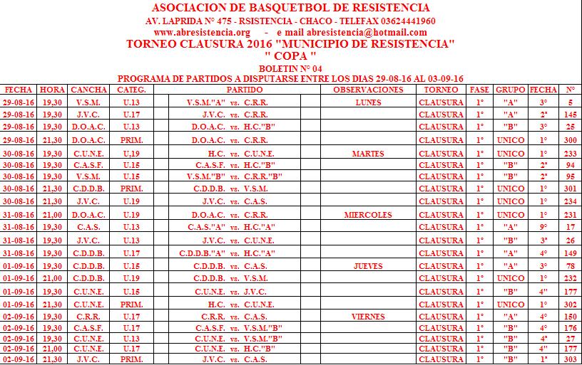 ASOCIACION DE BASQUETBOL DE RESISTENCIA. Programación de la ABR entre el 29 de Agosto y el 3 de Septiembre de 2016.