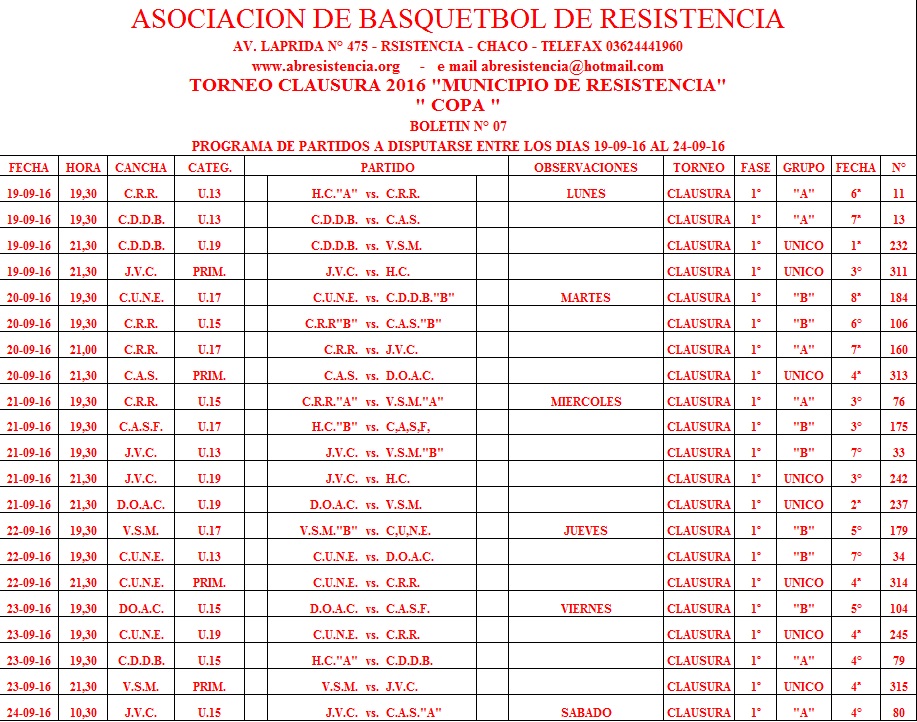 ASOCIACION DE BASQUETBOL DE RESISTENCIA. Programación de la ABR entre el 19 y el 24 de Septiembre de 2016.