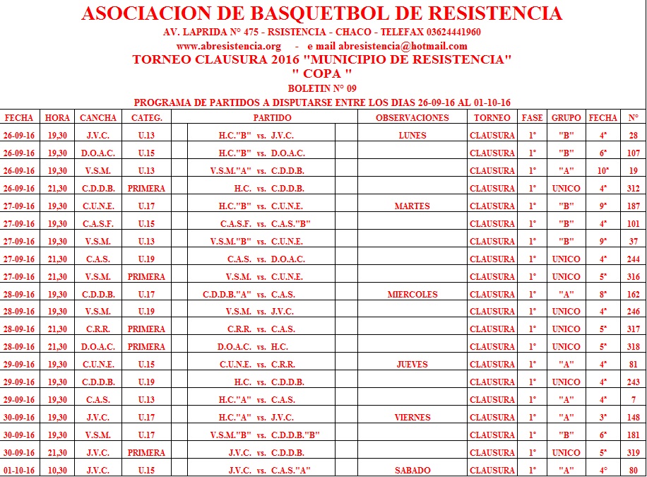 ASOCIACION DE BASQUETBOL DE RESISTENCIA. Programación de la ABR entre el 26 de Septiembre y el 1° de Octubre.