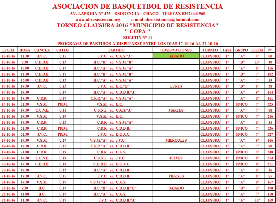 ASOCIACION DE BASQUETBOL DE RESISTENCIA. Programación de la ABR entre el 17 y el 22 de Octubre.
