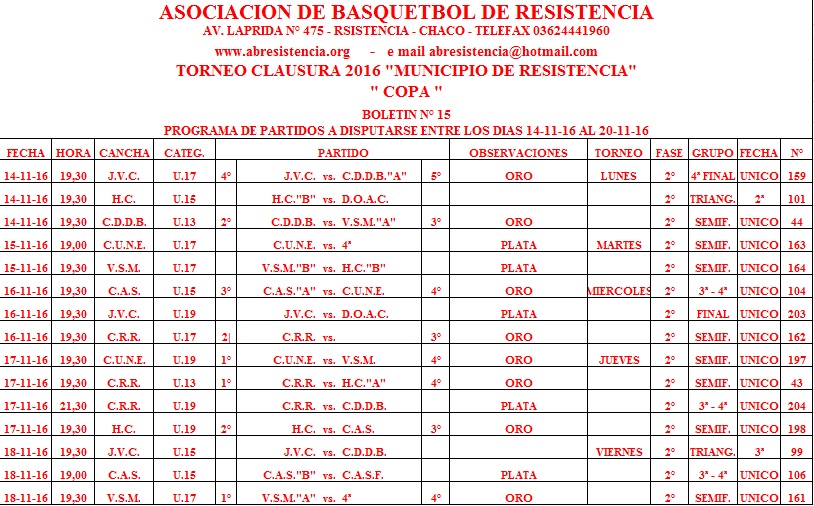 ASOCIACION DE BASQUETBOL DE RESISTENCIA. Programación de la ABR entre el 14 y el 20 de Noviembre.