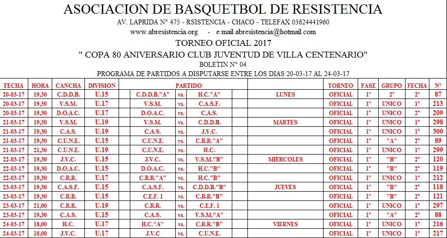 ASOCIACION DE BASQUETBOL DE RESISTENCIA. Programación de la ABR entre el 20 y el 24 de Marzo.