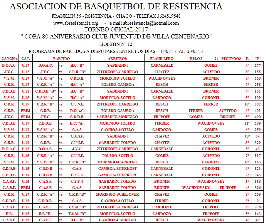 ASOCIACION DE BASQUETBOL DE RESISTENCIA. Programación de la ABR entre el 15 y el 20 de Mayo.