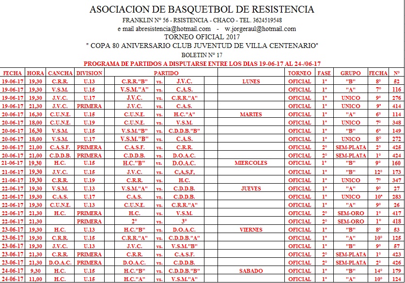 ASOCIACION DE BASQUETBOL DE RESISTENCIA. Programación de la ABR entre el 19 y el 24 de Junio.