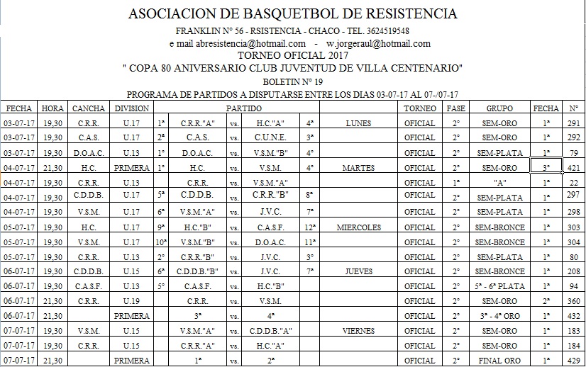 ASOCIACION DE BASQUETBOL DE RESISTENCIA. Programación de la ABR entre el 3 y el 7 de Julio.