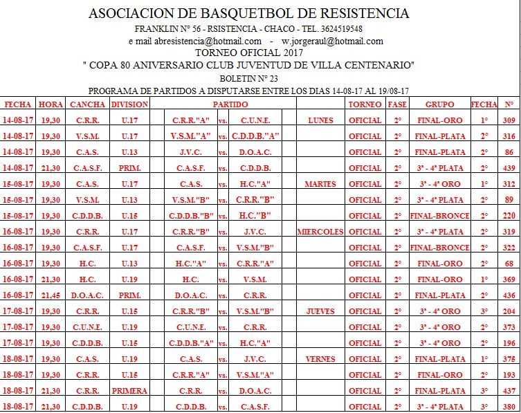 ASOCIACION DE BASQUETBOL DE RESISTENCIA. Programación de la ABR entre el 14 y el 19 de Agosto.