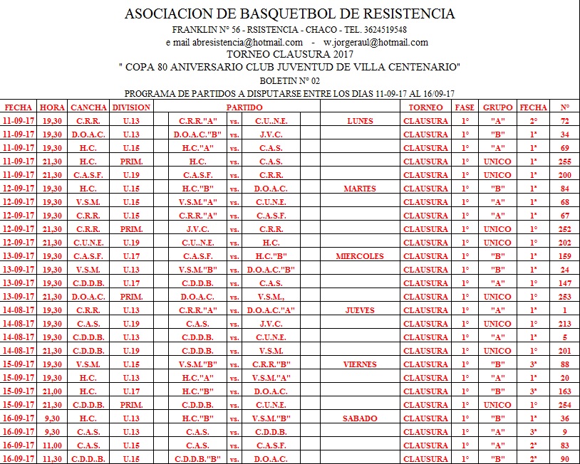 ASOCIACION DE BASQUETBOL DE RESISTENCIA. Programación de la ABR entre el 11 y el 16 de Septiembre.