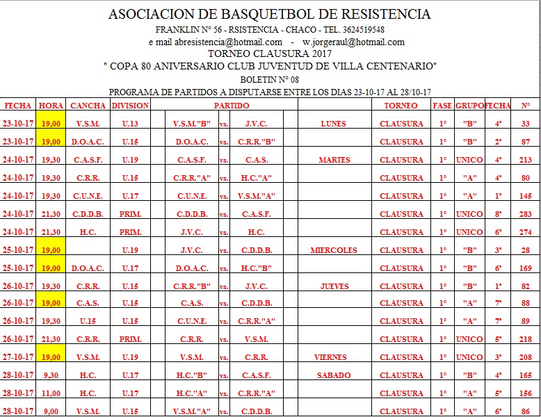 ASOCIACION DE BASQUETBOL DE RESISTENCIA. Programación de la ABR entre el 23 y el 28 de Octubre.