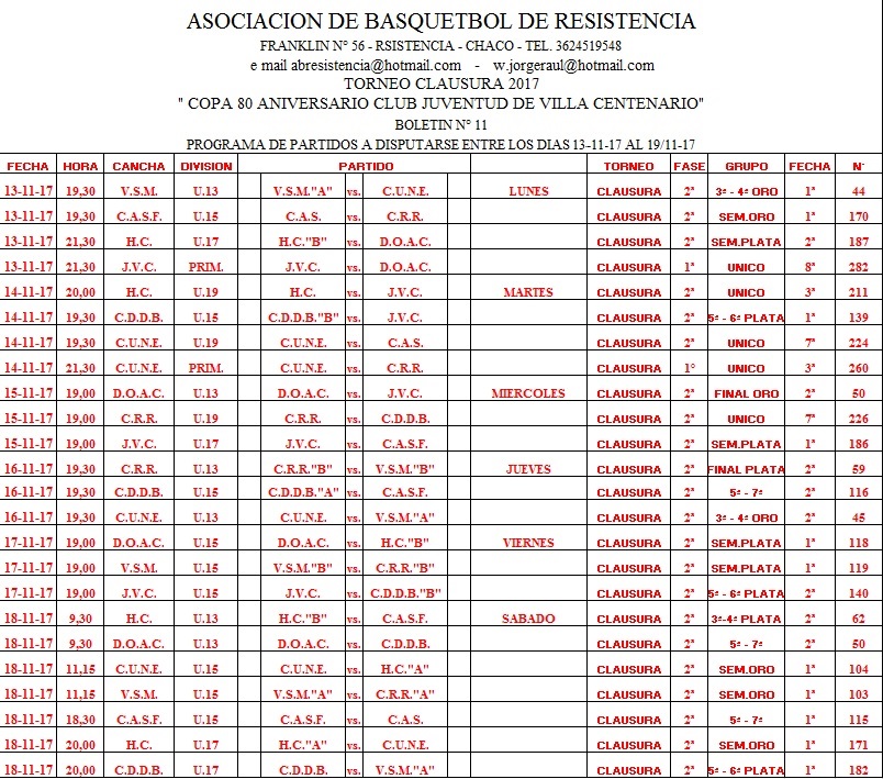 ASOCIACION DE BASQUETBOL DE RESISTENCIA. Programación de la ABR entre el 13 y el 19 de Noviembre.