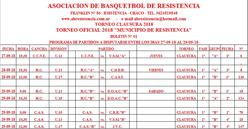 ASOCIACION DE BASQUETBOL DE RESISTENCIA. Programación de la ABR entre el 27 y el 29 de Septiembre.