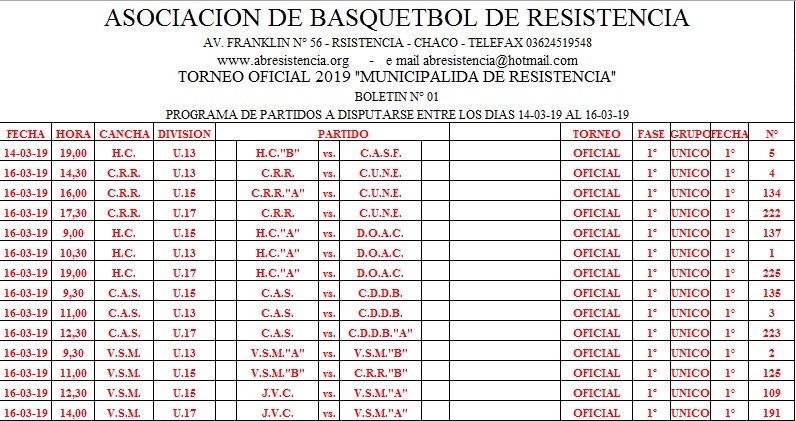 ASOCIACION DE BASQUETBOL DE RESISTENCIA. Programación de la ABR entre el 14 y el 16 de Marzo.