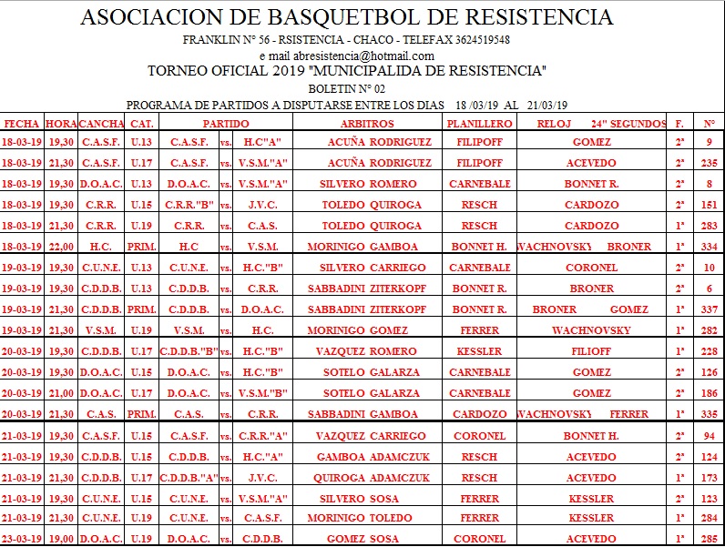 ASOCIACION DE BASQUETBOL DE RESISTENCIA. Programación de la ABR entre el 18 y el 21 de Marzo.