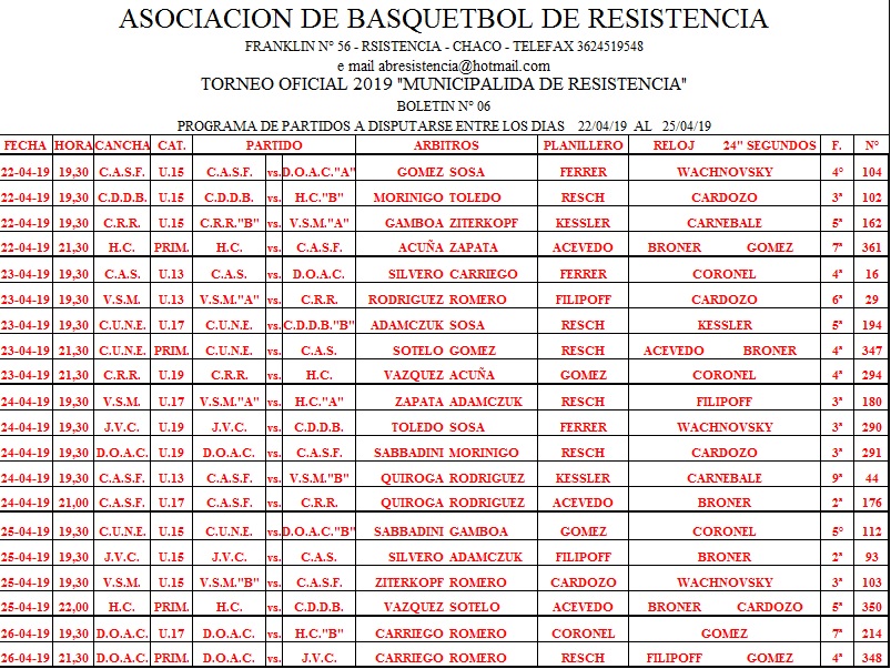ASOCIACION DE BASQUETBOL DE RESISTENCIA. Programación de la ABR entre el 22 y el 25 de Abril.