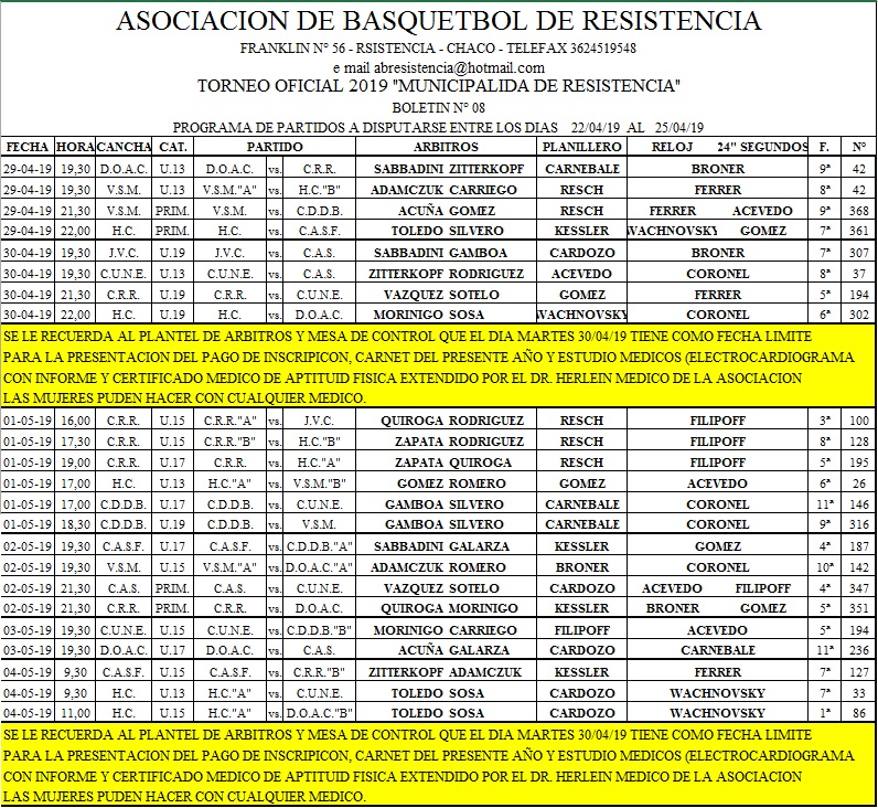 ASOCIACION DE BASQUETBOL DE RESISTENCIA. Programación de la ABR entre el 29 de Abril y el 4 de Mayo.