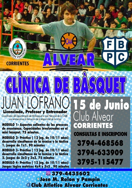 MINIBASQUET-FORMATIVAS. El Club Alvear de Corrientes organiza para el próximo 15 de éste mes una clínica que estará a cargo del reconocido Juan Lofrano. Lofrano es licenciado, profesor y entrenador y es Coordinador del departamento Minibasquet de la CABB a nivel nacional. “Una eminencia en la formación de la etapa inicial de los niños”. La Clínica a desarrollarse en el club Alvear –Rolón y Pampín- de la vecina Corrientes estará dividido en 4 módulos, 3 de ellos prácticos. Y entre los temas a tratar están: aspectos salientes de los procesos de enseñanza; capacidades involucradas en el minibasquet y desarrollo simultáneo de la técnica y la táctica.