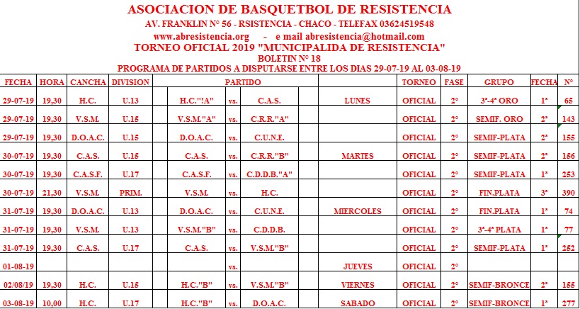 ASOCIACIÓN DE BÁSQUET DE RESISTENCIA. Programación de partidos de la ABR a disputarse entre el 29 de Julio y el 3 de Agosto.