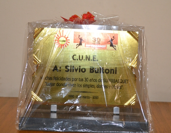 El partido que protagonizaron Cune y Pinedo Central, en el marco del Provincial de mayores 2019/20, sirvió de marco para que otra entidad del basquetbol metropolitano reconociera a Super Basquet por sus 30 años de vida. En el entretiempo del cotejo por la Reclasificación entre resistencianos y pinedenses, la dirigencia del basquetbol canario nos hizo entrega de una hermosa plaqueta que reza “Cune, a Silvio Buittoni. Muchas felicidades por los 30 años de Super Basquet, lugar donde viven los simples, dobles y triples”. Otra muestra de cariño, aprecio y respeto que quienes hacemos Super Basquet valoramos y agradecemos enormemente.