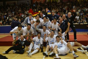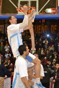 RITUAL. El MVP Leo Gutiérrez sostiene a Leiva mientras corta las redes.