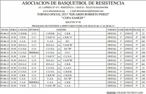 OFICIAL 2013. A continuación se detalla el programa de partidos de la Asociación de Basquetbol de Resistencia en la semana del 3 al 7 de junio próximos.