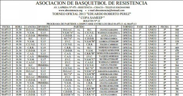 La siguiente es la programación correspondiente a la semana del 1 al 6 de julio de la Asociación de Basquetbol de Resistencia.