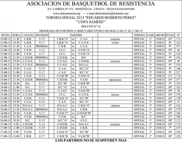 OFICIAL 2013. La siguiente es la programación correspondiente a la semana del 12 al 17 de agosto de la Asociación de Basquetbol de Resistencia.