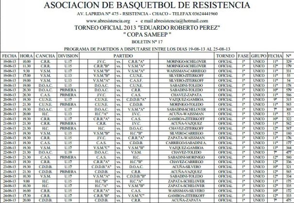 OFICIAL 2013. La siguiente es la programación correspondiente a la semana del 19 al 25 de agosto de la Asociación de Basquetbol de Resistencia.