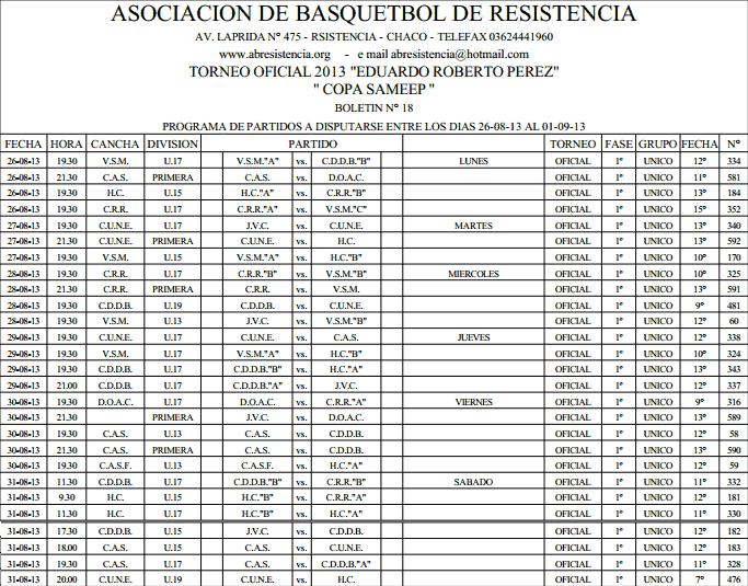 OFICIAL 2013. La siguiente es la programación correspondiente a la semana del 26 de agosto al 1° de septiembre de la Asociación de Basquetbol de Resistencia.