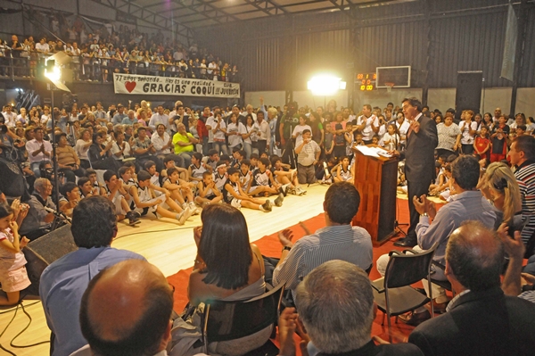 INSTITUCIONAL. Este lunes por la noche, el basquetbol vivió otra noche de fiesta toda vez que una institución tan tradicional como Juventud de Villa Centenario, pudo por fin inaugurar su flamante -y muy bello- estadio. El encargado del “salto inicial” de ésta nueva etapa de la Juve, fue el gobernador de la provincia, Jorge Milton Capitanich quien, horas antes, había entregado el remodelado estadio de Morava en Saenz Peña. Ante un gran marco de publico, acorde a lo que significa Juventud -tras la bendición de las instalaciones a cargo del cura párroco Mario Moreyra-, el titular del Ejecutivo provincial rescató al deporte como formador de valores. “Esta es la gran obra de una institución cuyo dirigentes siempre anhelaron hace 77 años convertir sus sueños en realidad. Es muy bueno aprender a disfrutar y valorar las obras que se hacen. Son esfuerzos de hombres y mujeres, que durante toda la historia han pretendido llevar el nombre de este club al más alto prestigio”, dijo Capitanich.