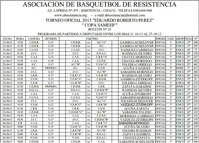 OFICIAL 2013. La siguiente es la programación correspondiente a la semana del 21 al 27 de octubre de la Asociación de Basquetbol de Resistencia.