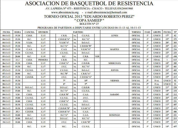 OFICIAL 2013. La siguiente es la programación correspondiente a la semana del 4 al 10 de Noviembre de la Asociación de Basquetbol de Resistencia.