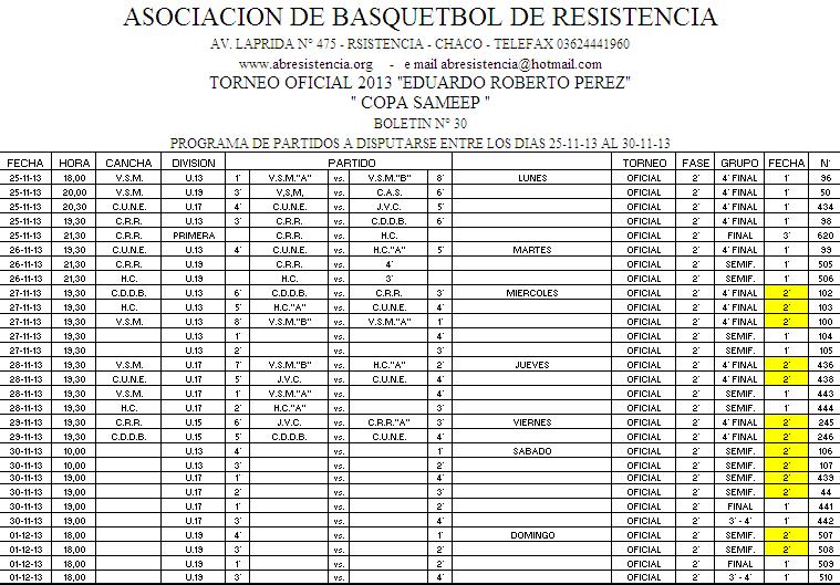 OFICIAL 2013. La siguiente es la programación correspondiente a la semana del 25 al 30 de Noviembre de la Asociación de Basquetbol de Resistencia.