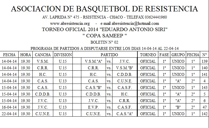 Programación de partidos de la ABR desde el 14 al 22 de abril de 2014. Comienzan a disputarse los juegos de la categoría U15 en la copa SAMEEP.