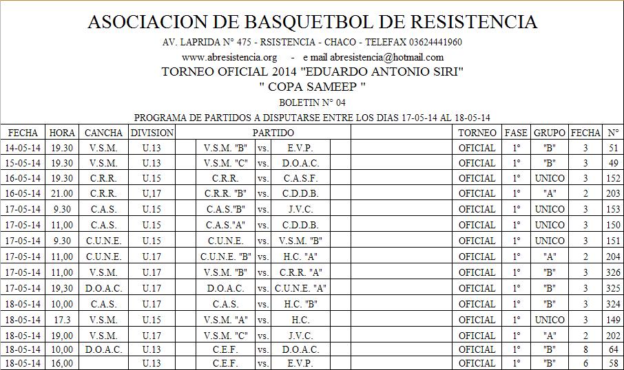 DIVISIONES FORMATIVAS. Programación de partidos de la ABR desde el 17 al 18 de mayo de 2014.