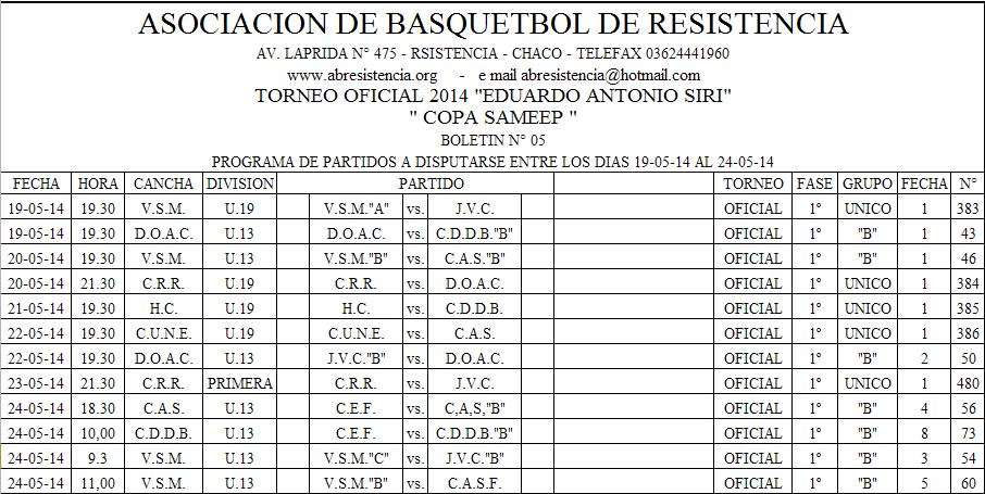 DIVISIONES FORMATIVAS. Programación de partidos de la ABR desde el 19 al 24 de mayo de 2014.