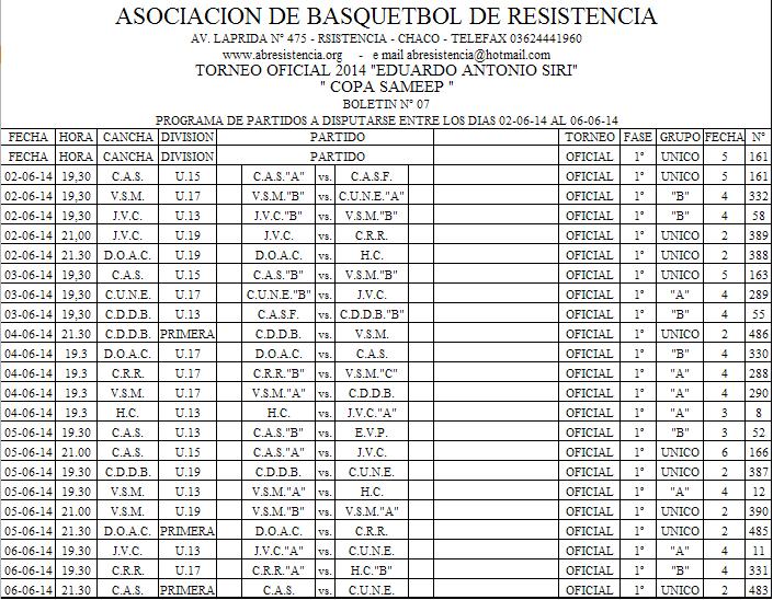 DIVISIONES FORMATIVAS. Programación de partidos de la ABR desde el 2 al 6 de junio de 2014.