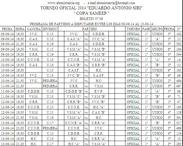 DIVISIONES FORMATIVAS. Programación de partidos de la ABR desde el 9 al 13 de junio de 2014.