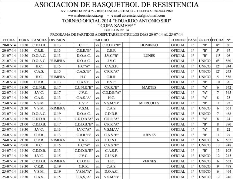 ASOCIACION DE BASQUETBOL DE RESISTENCIA. Programación de partidos de la ABR desde el 20 al 25 de julio de 2014.